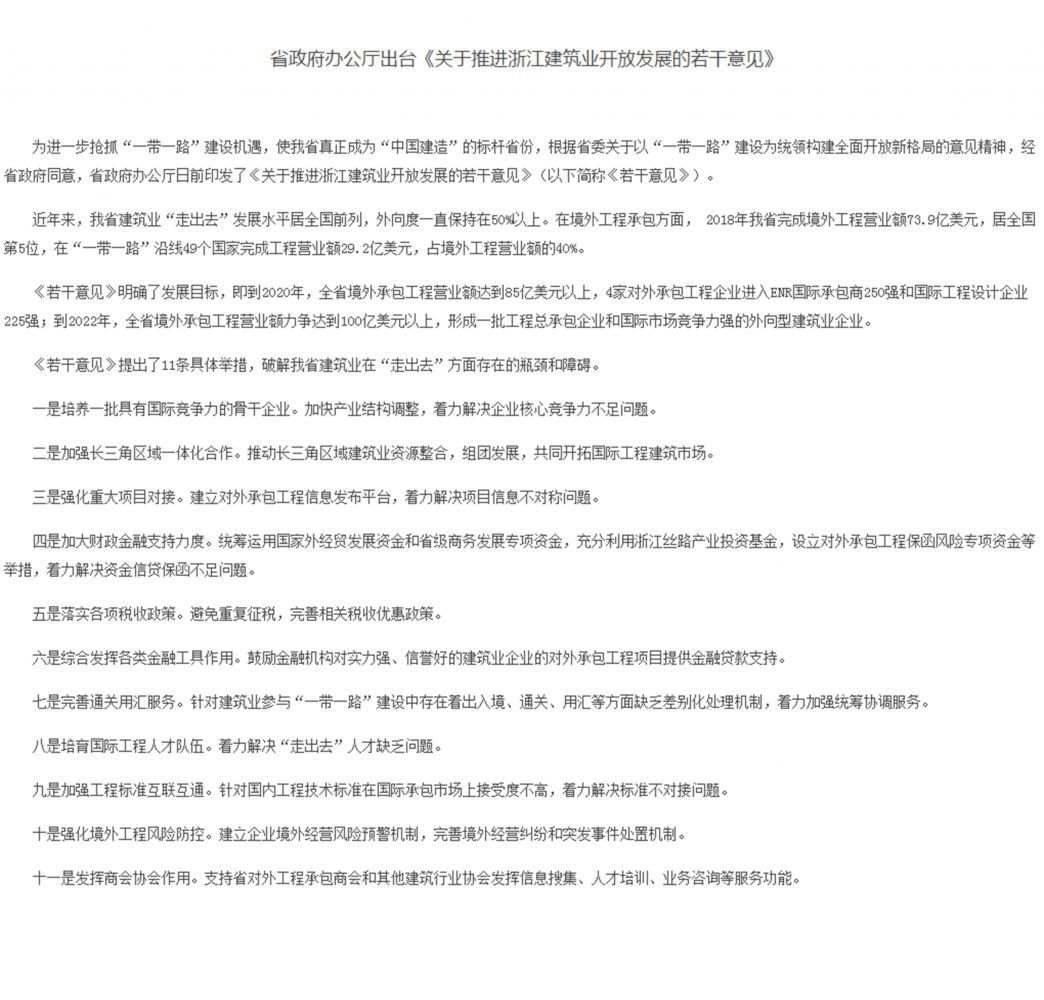 省政府辦公廳出臺(tái)《關(guān)于推進(jìn)浙江建筑業(yè)開(kāi)放發(fā)展的若干意見(jiàn)》